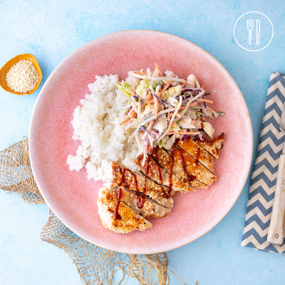 sushi rice, sesame seeds, aioli, free - range pork steaks, oriental coleslaw
