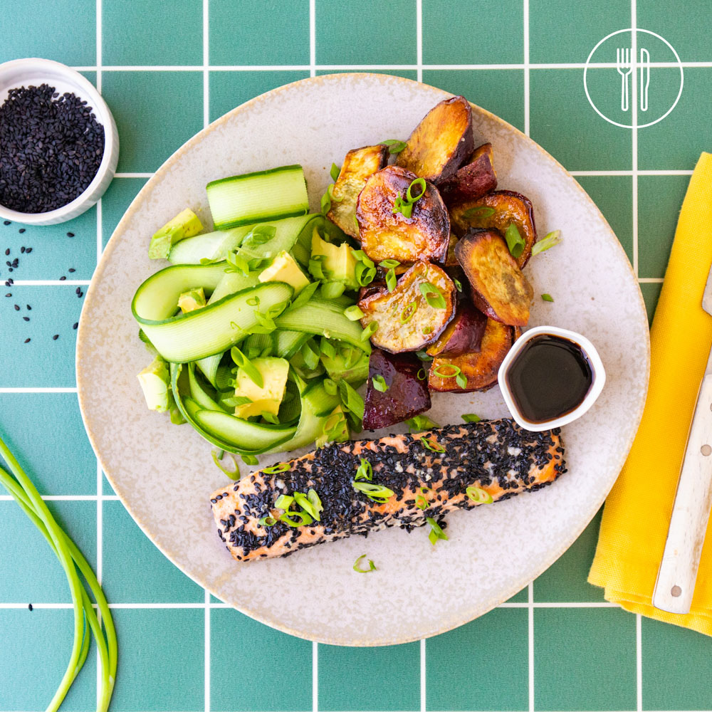 Sesame seed crusted salmon fillets, served with roasted purple sweet potatoes tossed in teriyaki sauce with fresh cucumber, avocado and chives.