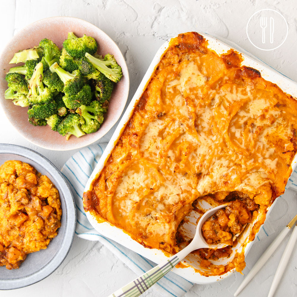 A hearty, homestyle lamb Shepherd’s pie topped with cheesy sweet potato mash and baked until golden, served with tender broccoli on the side for a comforting meal the whole family will enjoy.