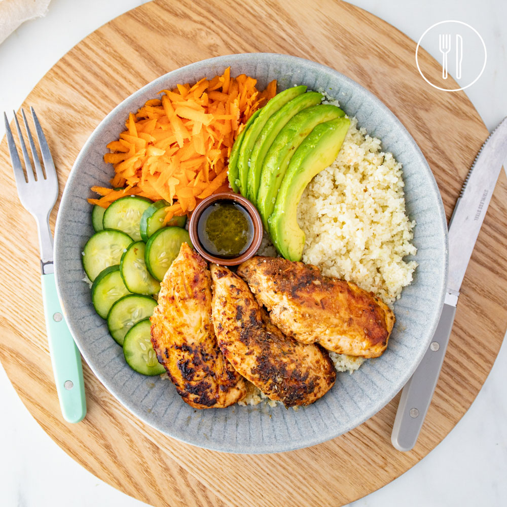Smoky chicken tenderloins served over cauliflower rice with pickled and fresh vegetables and a drizzle of zingy lime dressing.