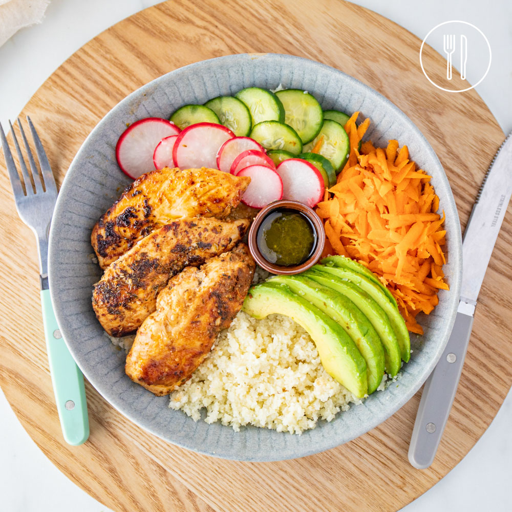 Smoky chicken tenderloins served over cauliflower rice with pickled and fresh vegetables and a drizzle of zingy lime dressing.