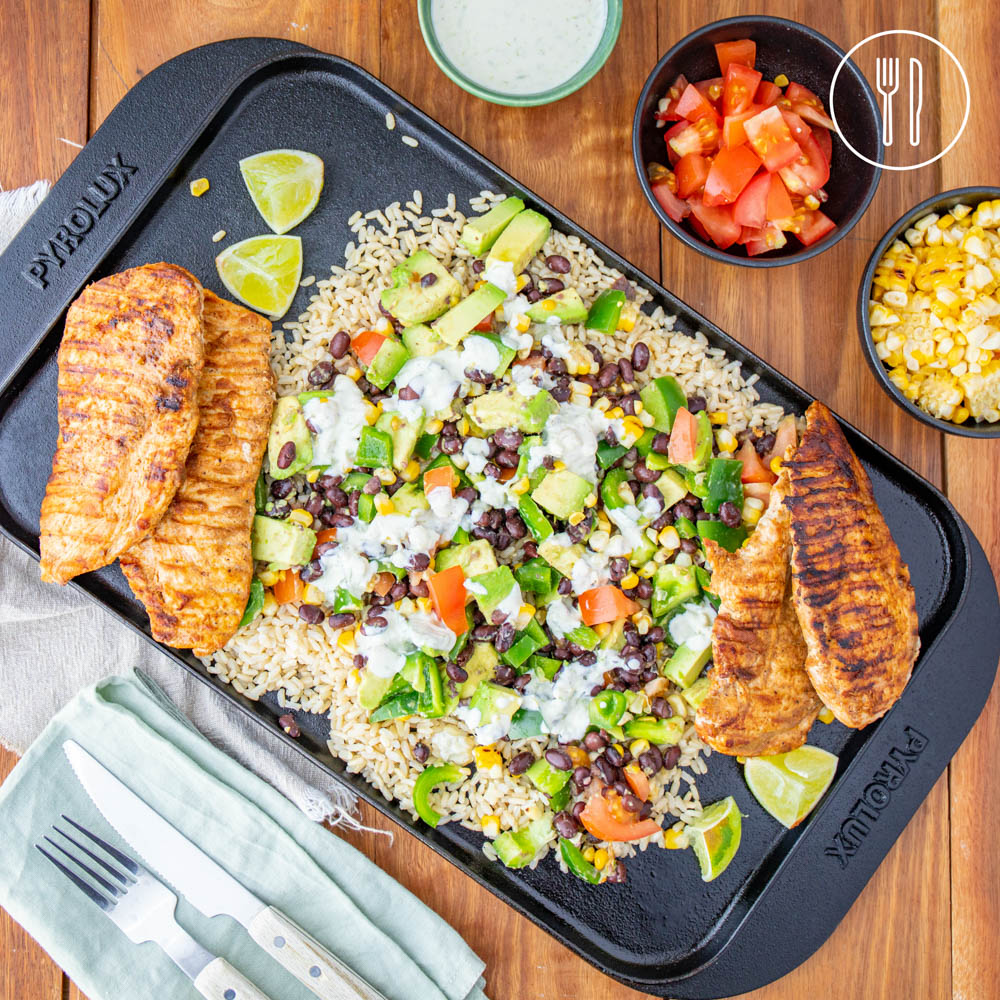Smoky chicken schnitzels served over brown rice, black beans and barbecued corn salsa with lime and garlic yoghurt.