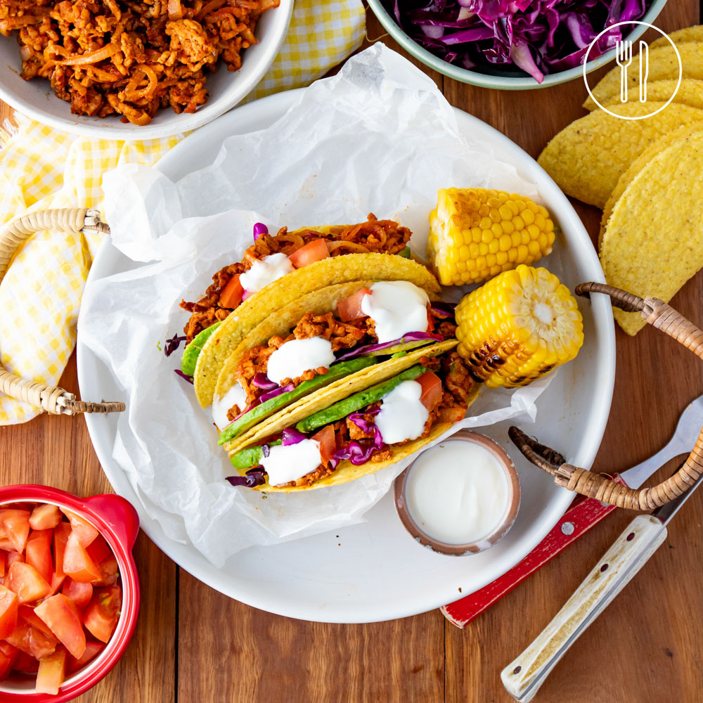 Smoky pork mince served with a rainbow or red cabbage, diced tomato and avocado slices, stuffed into crunchy taco shells with tangy yoghurt.