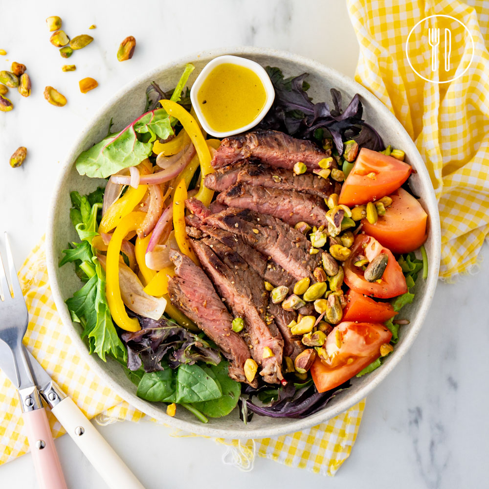 Hearty salad with layers of flavours and textures. Sweet cooked onion and capsicum served with fresh lettuce leaves, moist steaks, crunchy pistachios and a zesty vinaigrette.