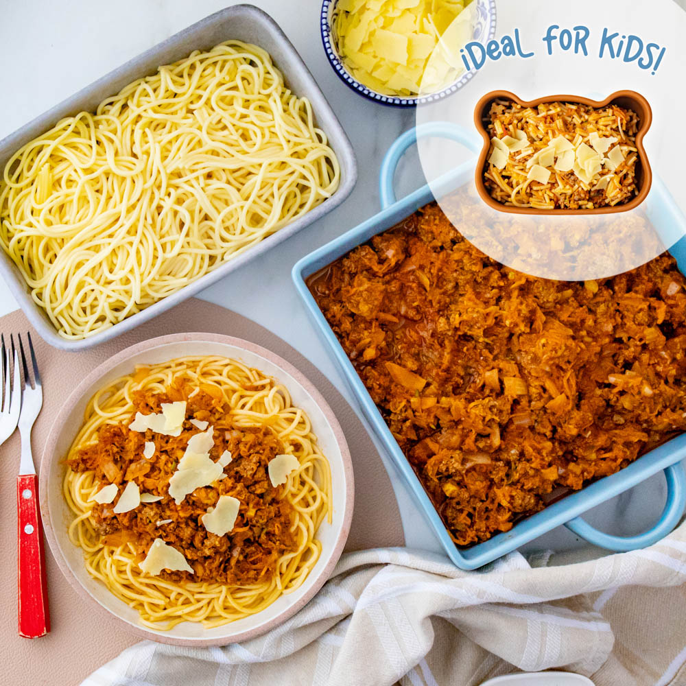 A classic bolognese recipe tossed through spaghetti pasta and topped with parmesan cheese to serve.