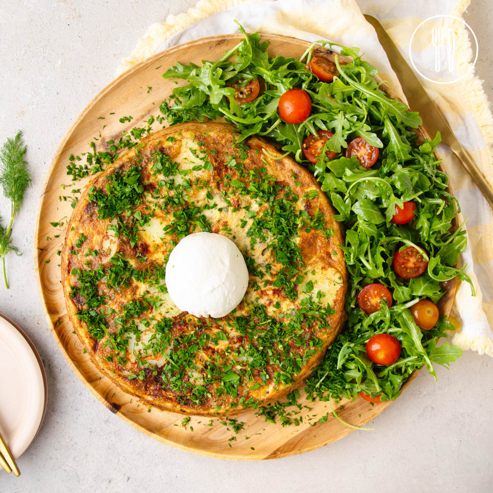 A golden, oven-baked egg and potato tortilla, topped with creamy burrata and fresh herbs, finished with a bright tomato and rocket salad for balance and freshness.
