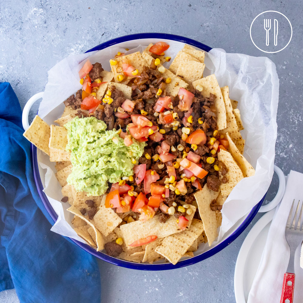 Crunchy tortilla strips topped with Mexican beef mince, creamy avocado and a tomato and corn salsa.