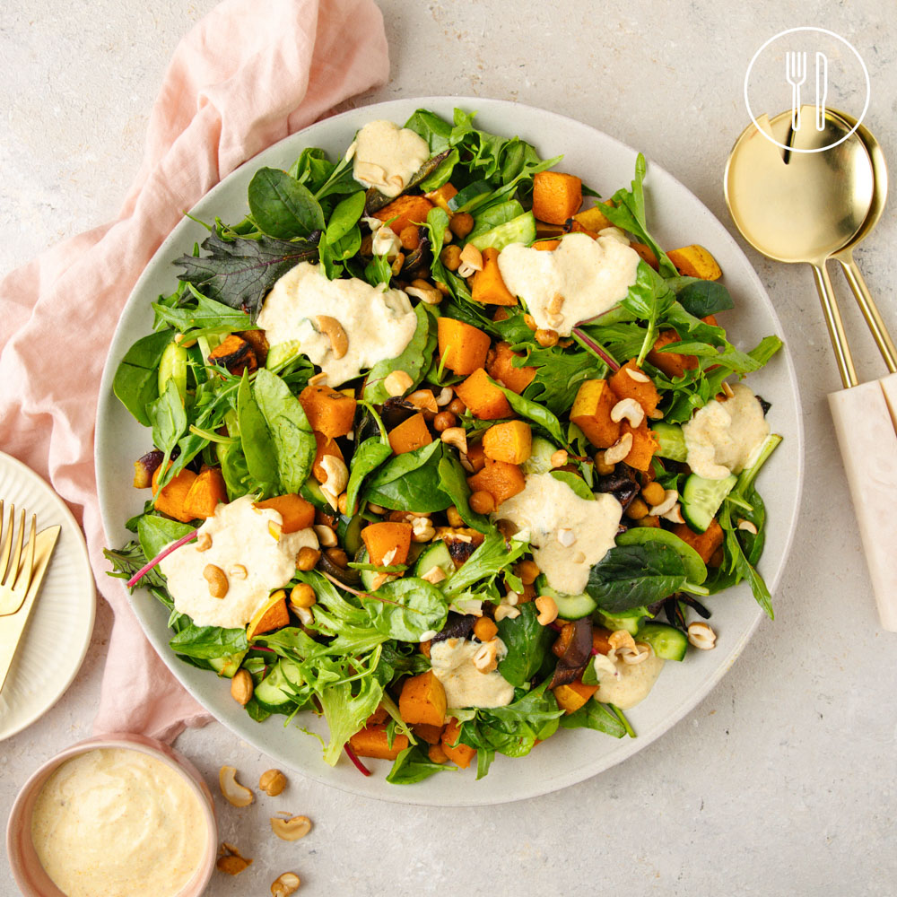 Maple roasted butternut pumpkin and chickpeas toss with fresh mesclun leaves and cucumber, finished with a spiced yoghurt dressing and chopped cashews.