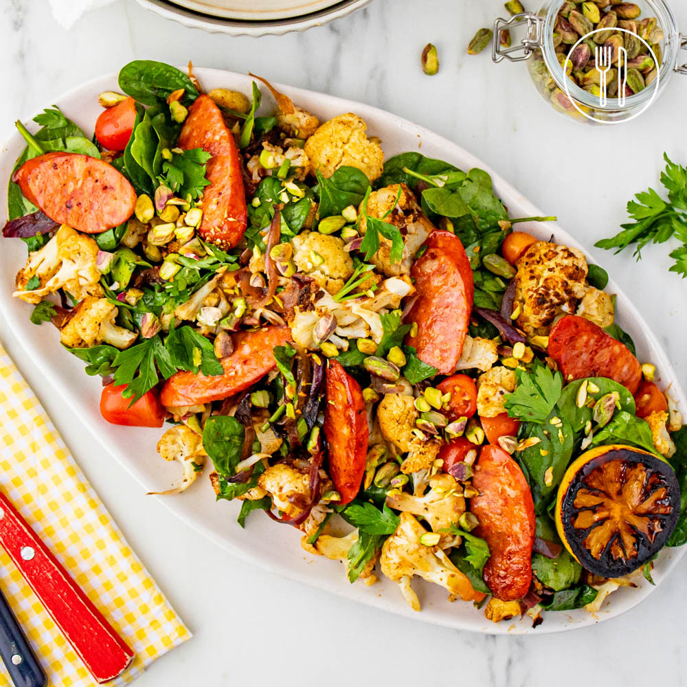Smoky cauliflower florets roasted in the oven with sweet red onion, tossed with a fresh lemon-dressed salad and topped with spiced sausage and pistachios.