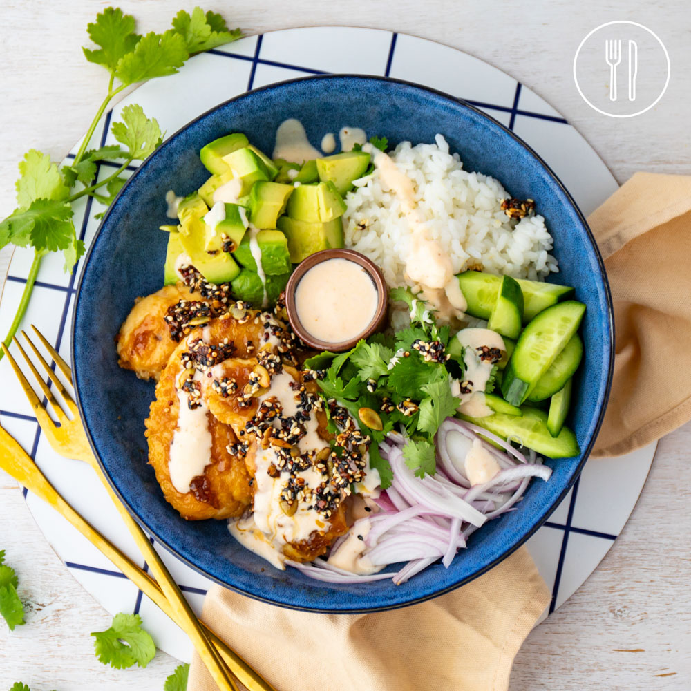 Crispy ginger chicken served over sushi rice with fresh avocado, crunchy cucumber and coriander, spicy aioli and surprising sesame seed clusters.