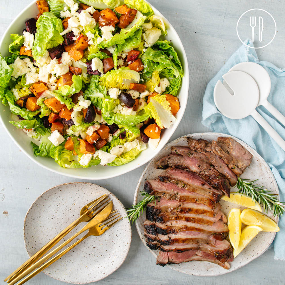 Lemon and rosemary marinated butterflied lamb, cooked on the griddle until charred. Served with a honey dressed beetroot, sweet potato and gem lettuce salad with crumbled feta.