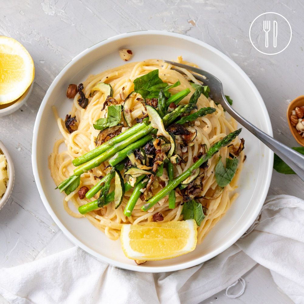 free-range eggs, hazelnuts, long pasta, parmesan cheese, basil, asparagus, lemon, zucchini, garlic clove