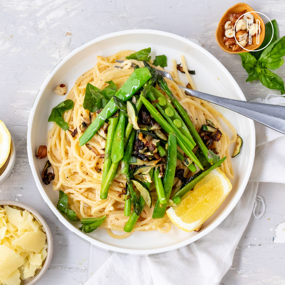 Creamy egg and parmesan cheese spaghetti carbonara, served with sautéed spring vegetables, hazelnuts, crispy zucchini and fresh basil.
