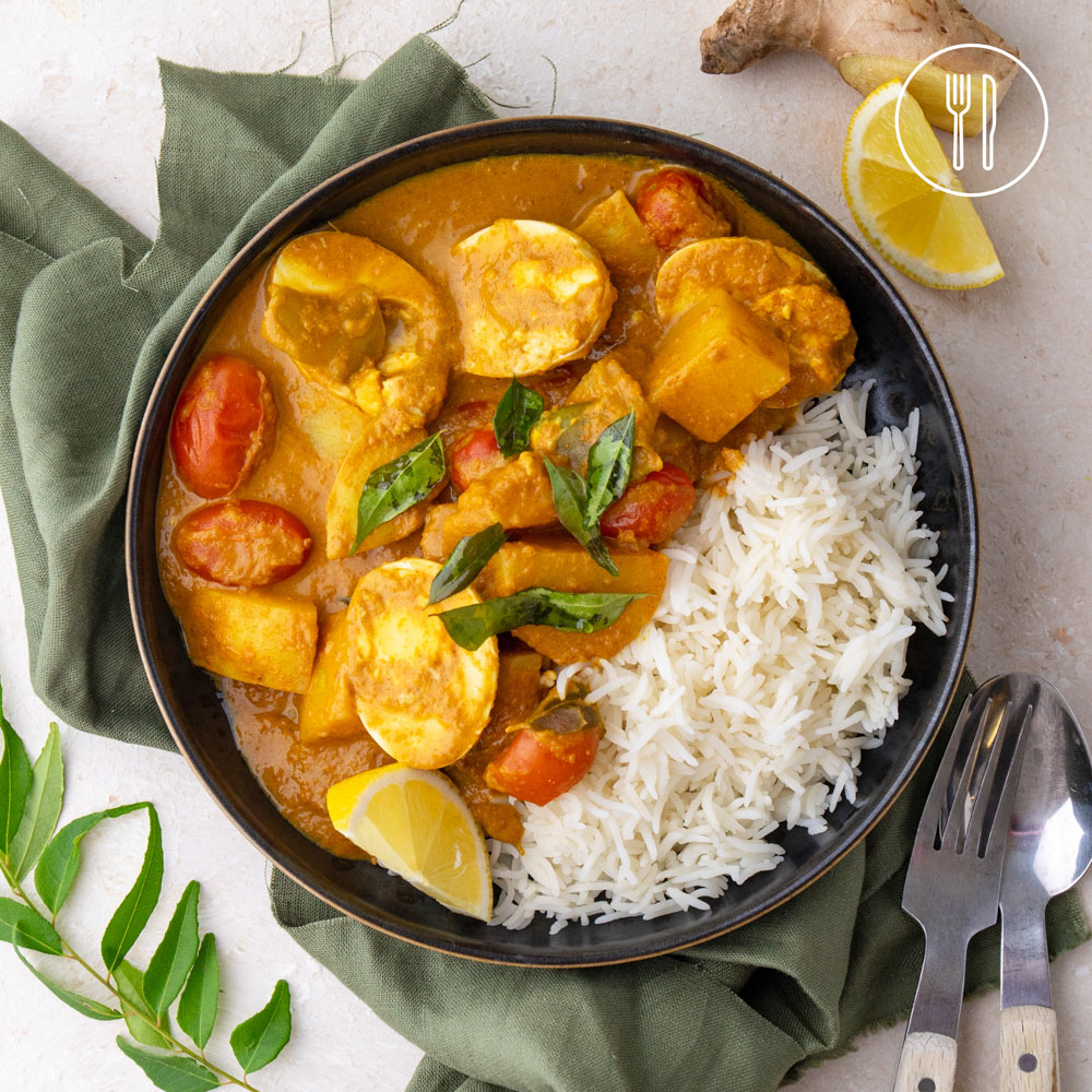 free-range eggs, Sri Lankan spice mix, coconut milk, basmati rice, cherry tomatoes, green capsicum, ginger, curry leaves, lemon, brown onion, medium red potato