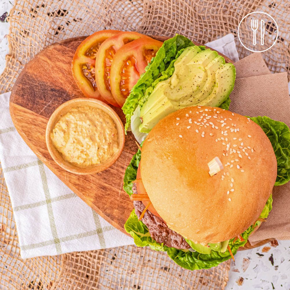 Soft burger buns filled with all the classics - crisp lettuce, fresh tomato, avocado and juicy beef burger patties complemented by a classic burger sauce!