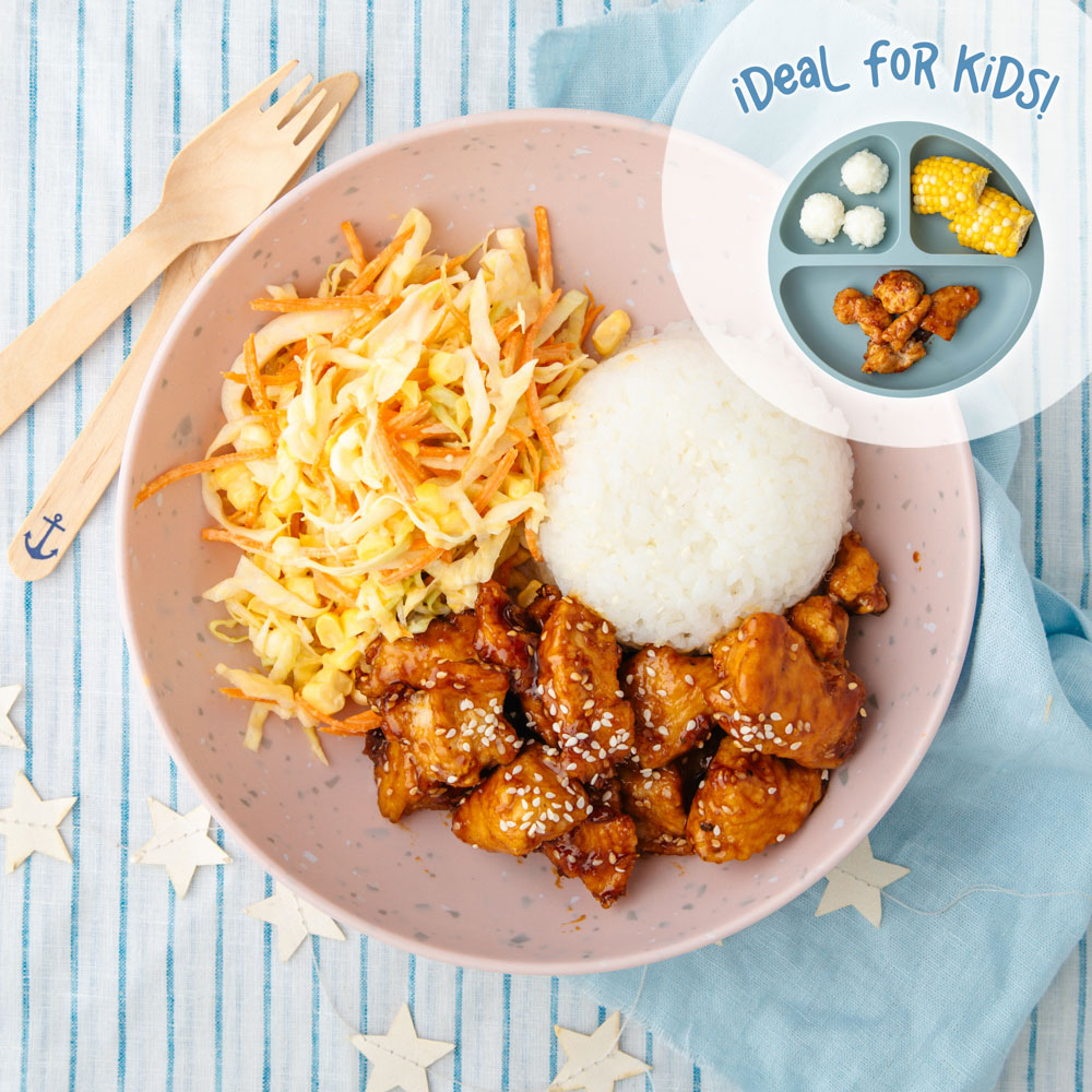 Sticky miso chicken cooked in a sweet and savoury sauce, served with fluffy rice and crunchy slaw.