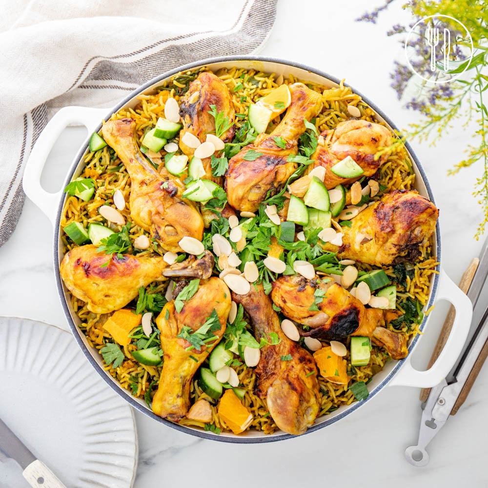 Free-range chicken drumsticks roasted in a homemade orange and turmeric marinade, served over a veggie-loaded and flavourful rice pilaf, made using Turban Chopsticks Majestic Almond Cumin Pilaf Kit!