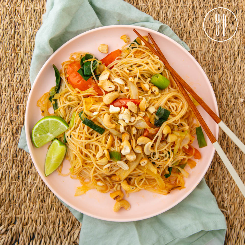 Veggie-packed noodle stir-fry with thin rice vermicelli, shredded cabbage, tomatoes, and spring onions, tossed in a spiced sauce and topped with crunchy roasted cashews