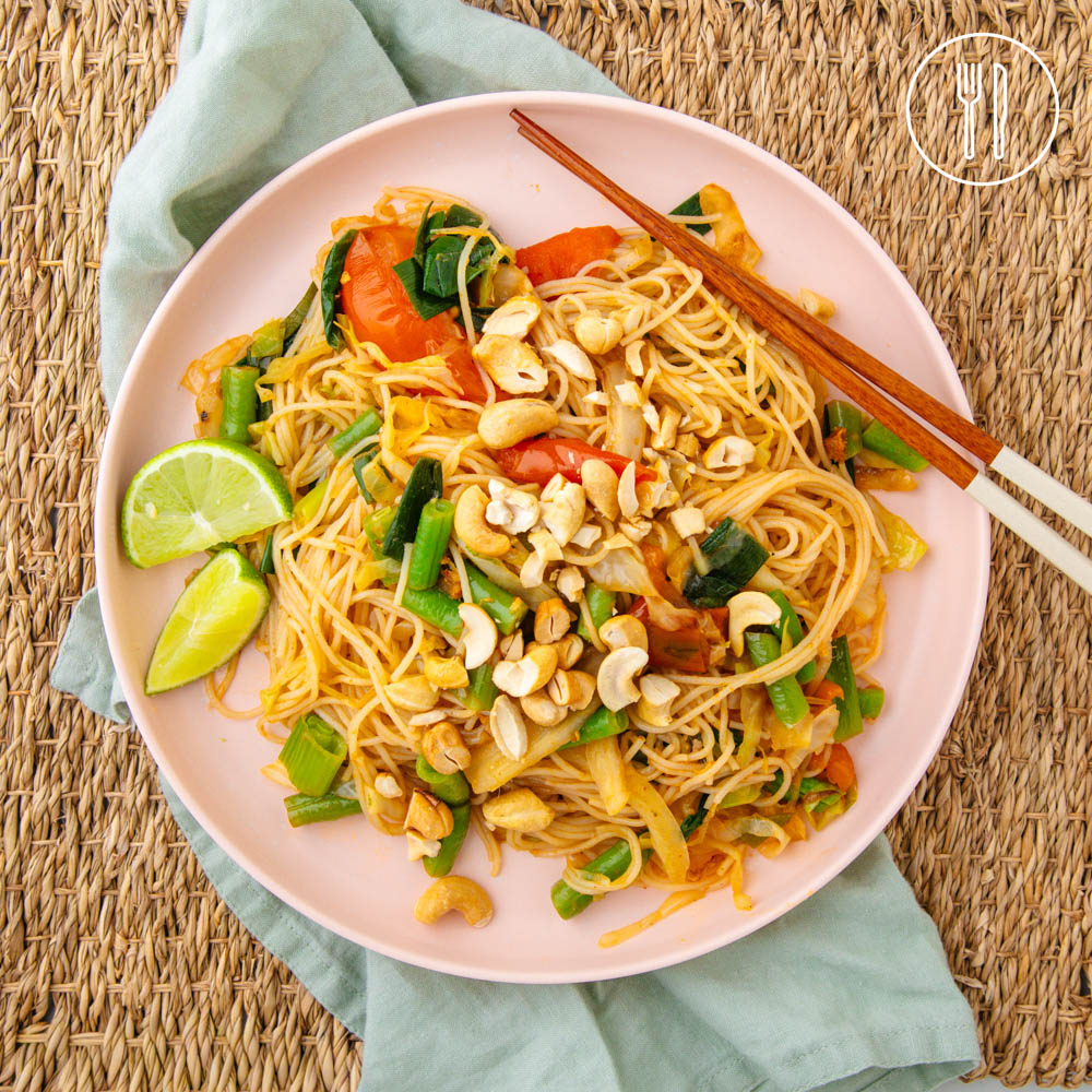 Veggie-packed noodle stir-fry with thin rice vermicelli, shredded cabbage, tomatoes, and spring onions, tossed in a spiced sauce and topped with crunchy roasted cashews
