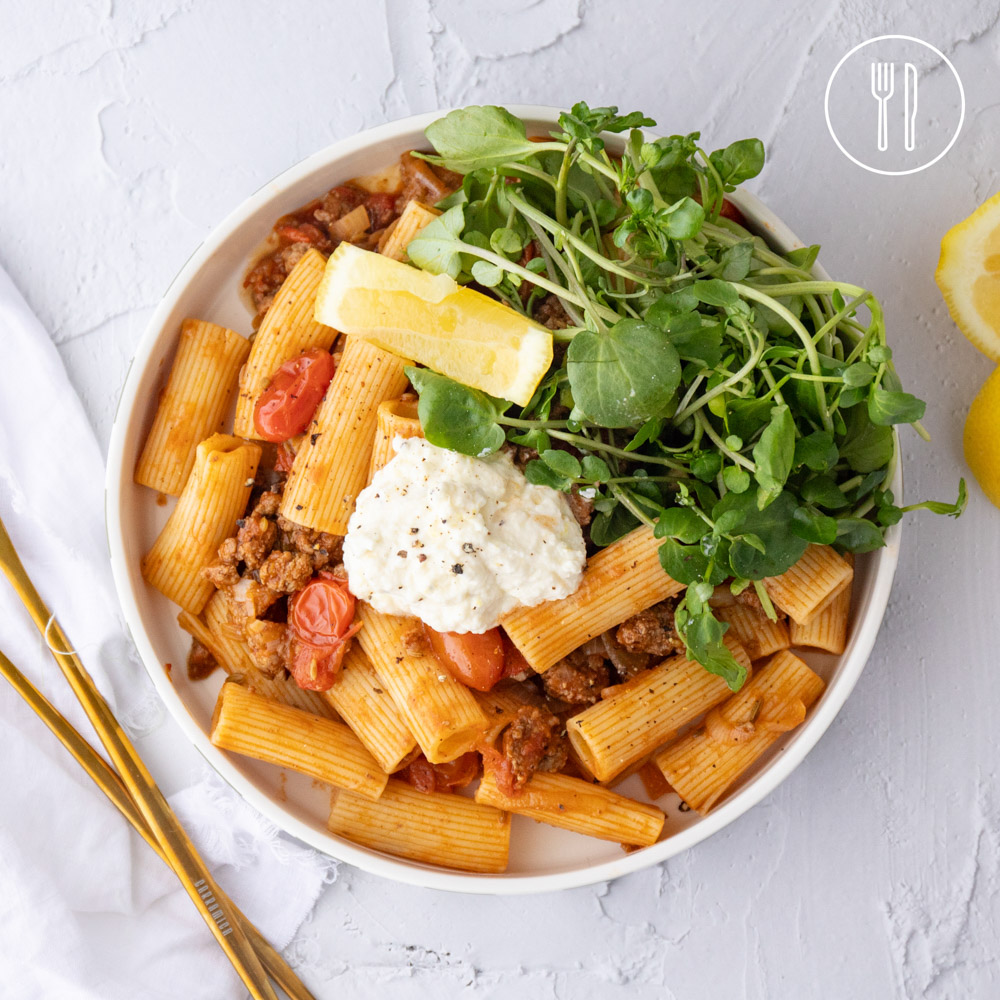 A light and vibrant beef and cherry tomato sauce, tossed through rigatoni pasta, served with zesty lemon ricotta and fresh watercress.