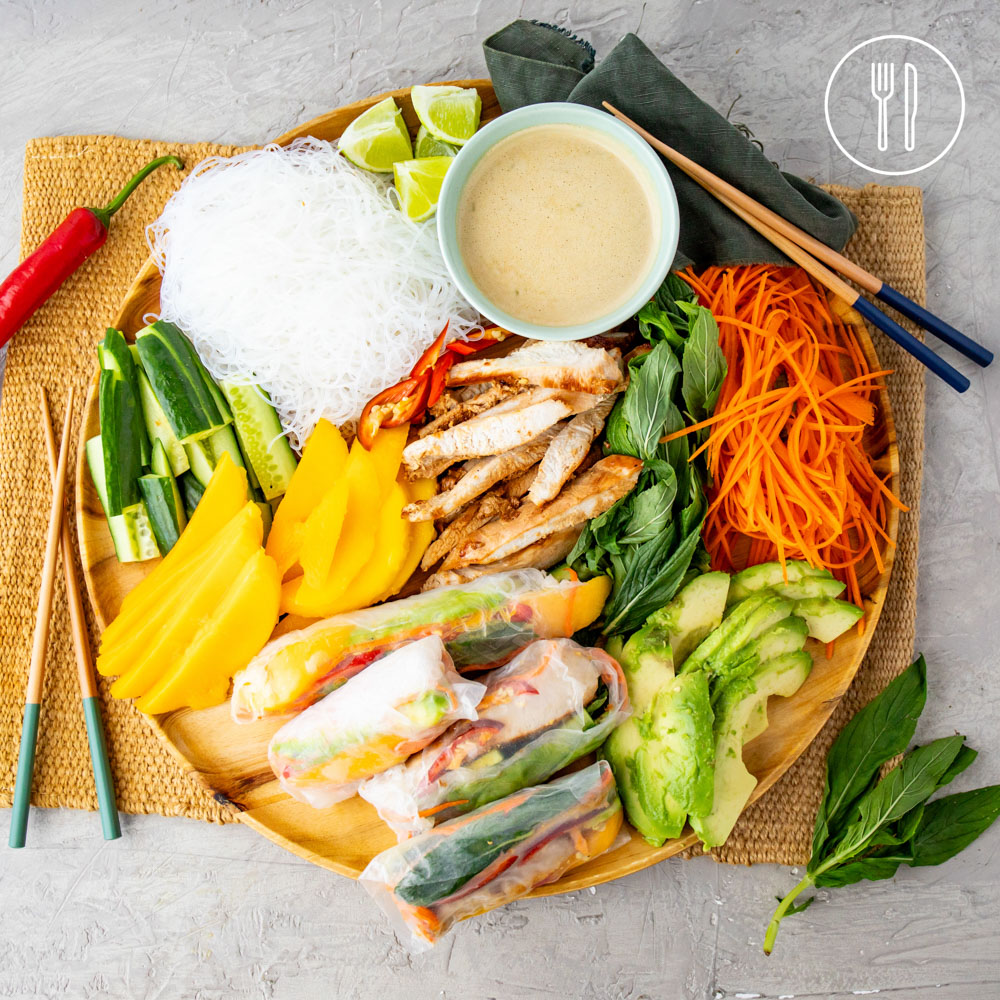 chicken schnitzels, peanut butter, bean thread noodles, rice paper rounds, coconut milk, mint, avocado, carrot, red chilli, Lebanese cucumber, lime, mango