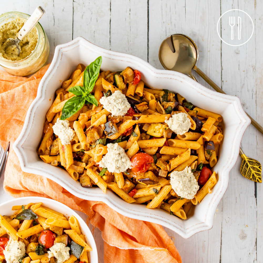 raw cashew and nutritional yeast mix, tinned cherry tomatoes, GF Vegan Penne, basil, eggplant medium, lemon, brown onion, zucchini, garlic clove
