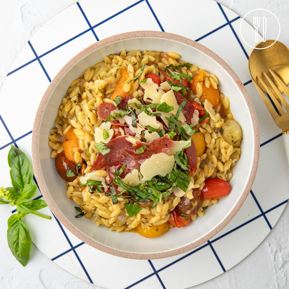 This bright, summery risoni dish brings together bursting cherry tomatoes, fresh basil, and golden crispy salami. An easy, one-pan dinner that delivers big flavour with minimal cooking fuss.