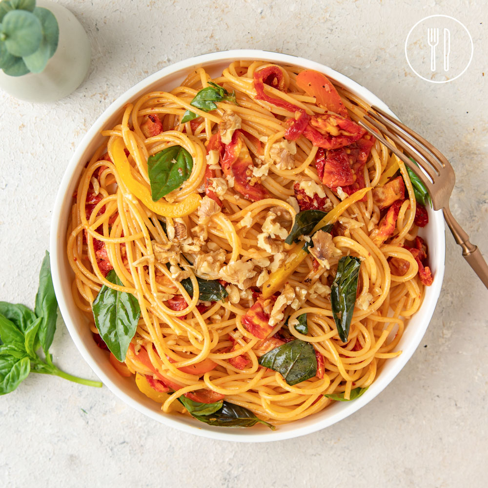 A vibrant pasta dish with sautéed capsicum, sun-dried tomatoes, garlic, and fresh basil. Tossed through tender spaghetti and topped with chopped walnuts.