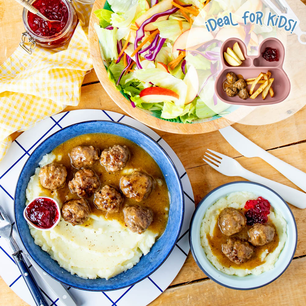Swedish style meatballs served in a homemade gravy over creamy mashed potatoes and finished with cranberry sauce.