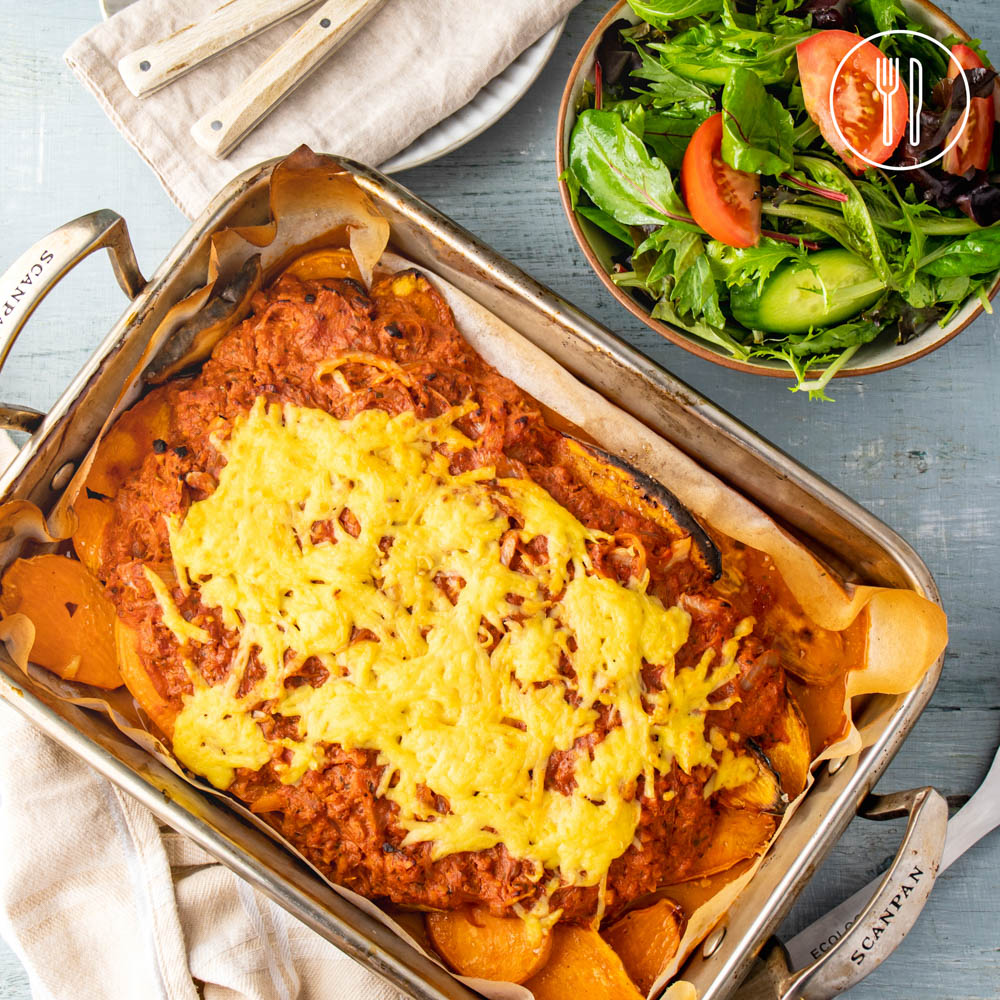 Roasted sweet potato slices topped with walnut and tomato sauce finished with cheddar cheese and served with a balsamic dressed garden salad.