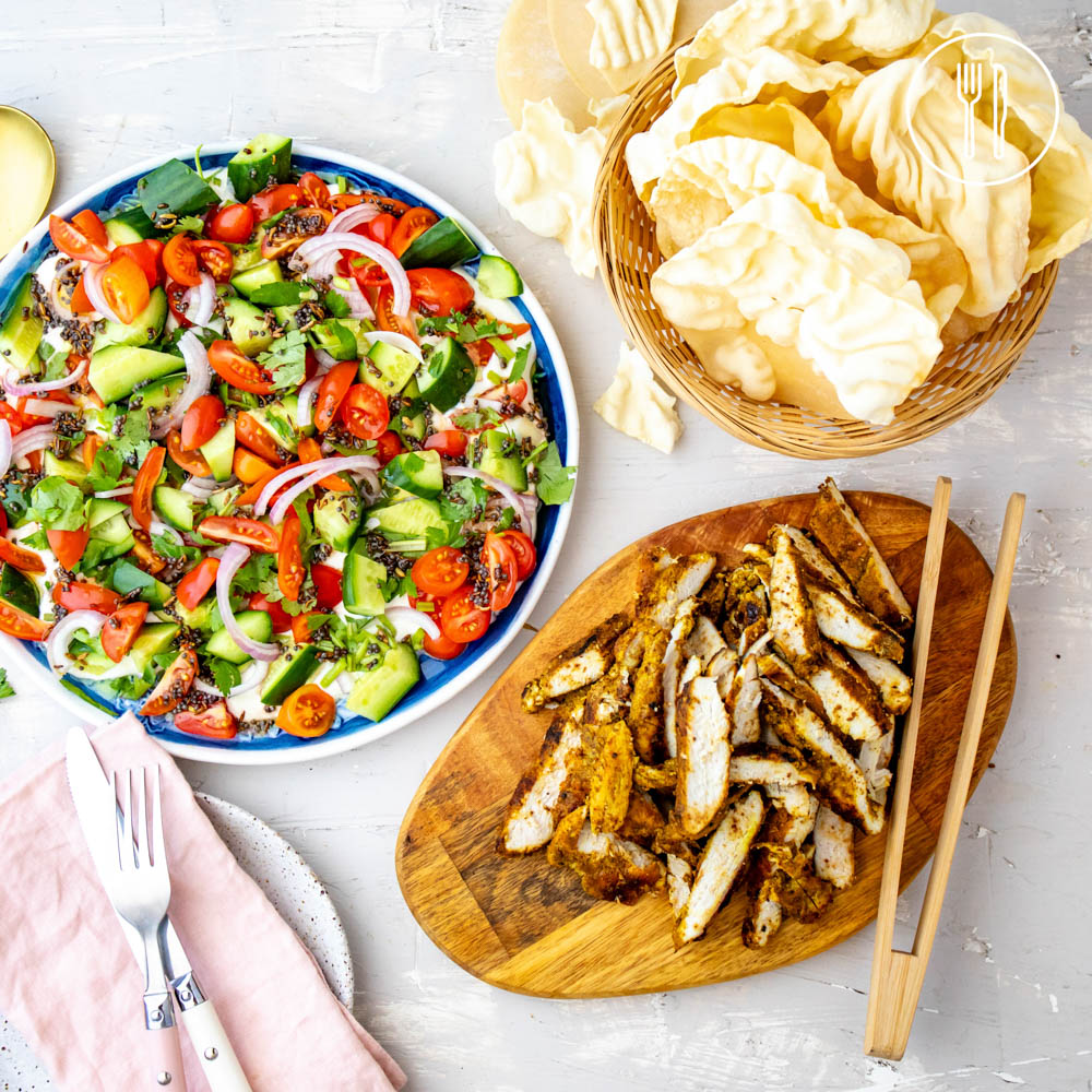 Chicken schnitzels cooked with an aromatic Tandoori spice paste from Island Curries, alongside a fresh and cooling cucumber salad with toasted spices and yoghurt dressing.