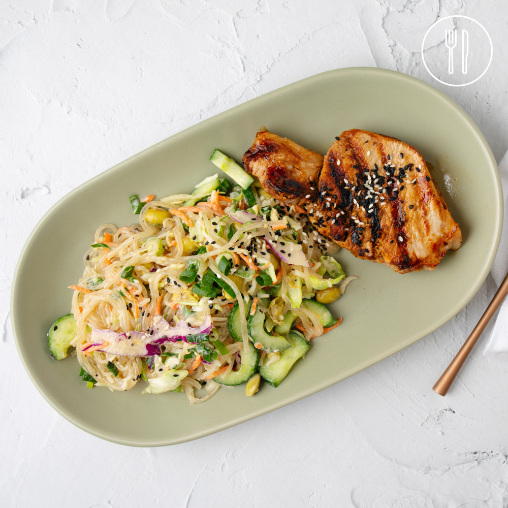 Juicy teriyaki pork steaks served with a Japanese-style cabbage slaw tossed with edamame beans, sweet potato noodles and creamy sesame dressing.