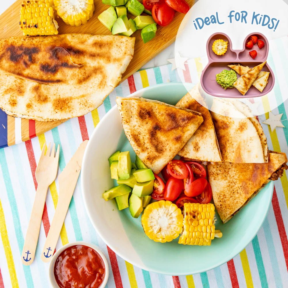Cheesy quesadillas with Mexican beef and salad, served with grilled corn cobs. A great platter-style dinner!