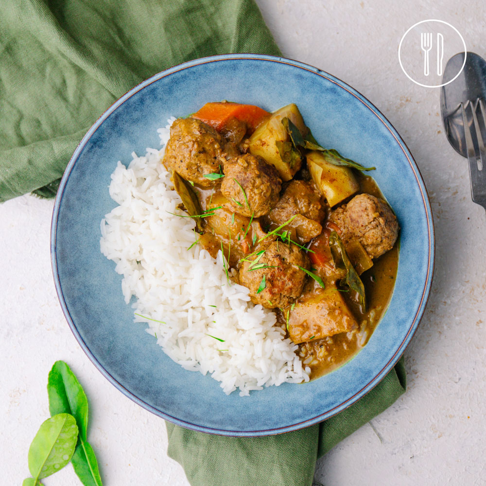 A fragrant Massaman beef meatball curry with vegetables, simmered in coconut milk and served with rice.