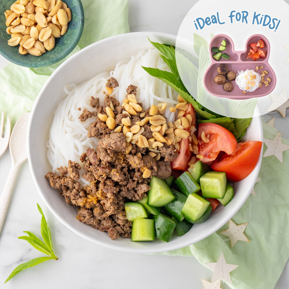 This dish is flavourful and healthy, perfect for little ones! Seasoned beef mince served over noodles with fresh veggies and a tangy dressing. Easy to customise for the whole family!