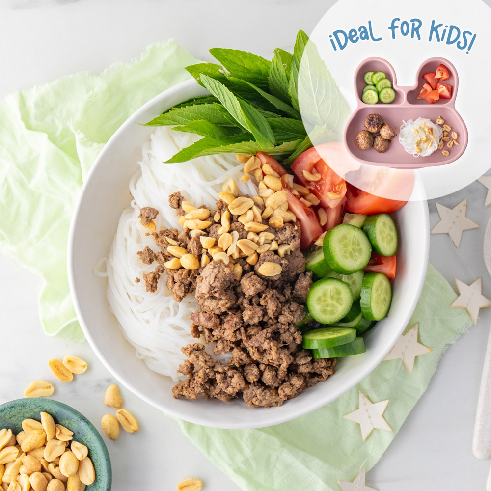 This dish is flavourful and healthy, perfect for little ones! Seasoned beef mince served over noodles with fresh veggies and a tangy dressing. Easy to customise for the whole family!