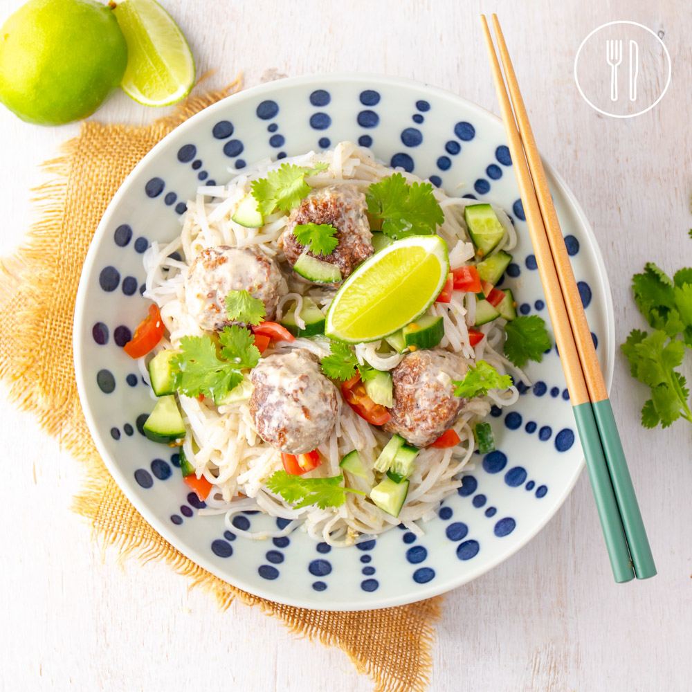 A mild and flavourful green curry spice mix, cooked with creamy coconut milk and flavourful chicken meatballs, served over rice noodles with fresh toppings.