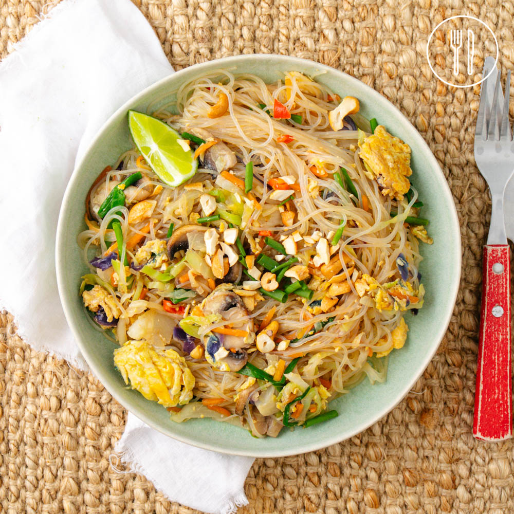 A vibrant Thai-style noodle dish with bean thread vermicelli, scrambled eggs, tossed in a zesty chilli-lime dressing and finished with crunchy cashews.