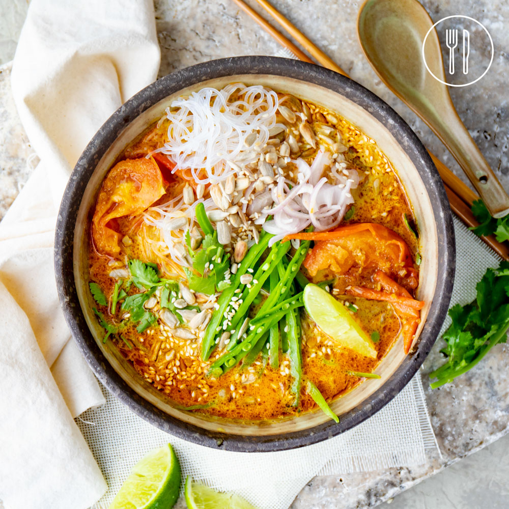 A fragrant and creamy coconut red curry laksa with bean thread noodles, topped with fresh snow peas, thinly sliced shallot and coriander. Finished with a savoury sprinkle of toasted seeds and a squeeze of lime.