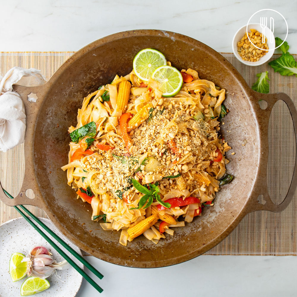 Fragrant rice noodles tossed with baby corn, capsicum, and Asian greens in a bold Thai-style stir-fry sauce, topped with a crunchy peanut-hemp crumb and a squeeze of lime.