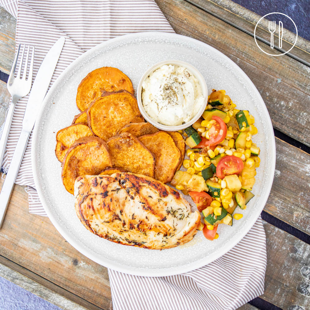 Golden chicken schnitzels with a veggie succotash featuring corn, zucchini and tomato, all served with roast sweet potato rounds and feta cream.
