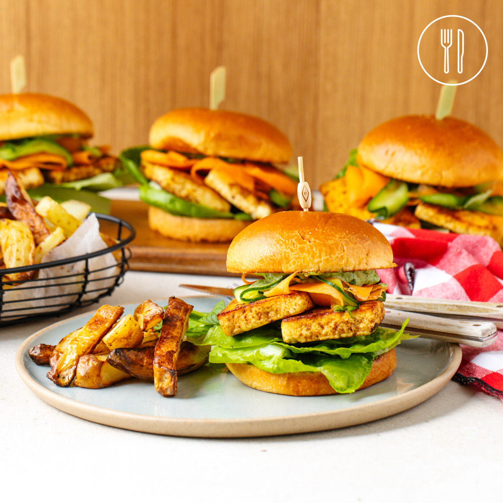 Spiced and golden paneer served in toasted brioche buns with pickled ribbon salad and mint aioli, paired with oven-baked potato chips.