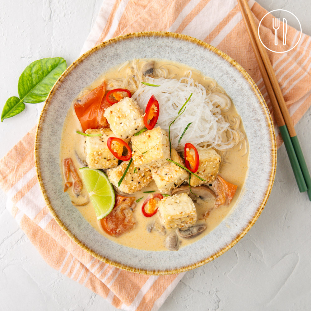 A fragrant coconut Tom Kha soup infused with kaffir lime leaves and umami stock, served with bean thread noodles, and topped with crispy golden tofu.