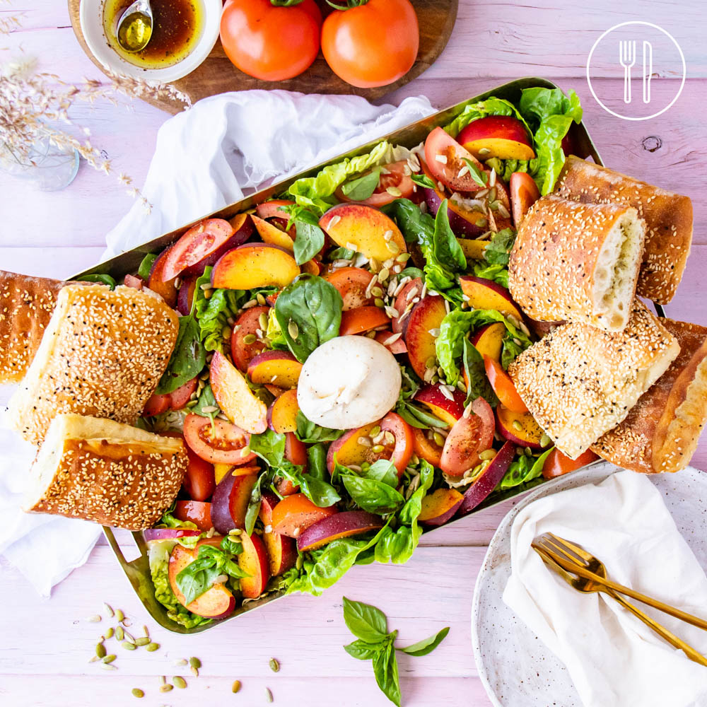 sunflower and pepita seed mix, Turkish bread rolls, burrata, basil, gem lettuce, tomato, garlic clove, peach