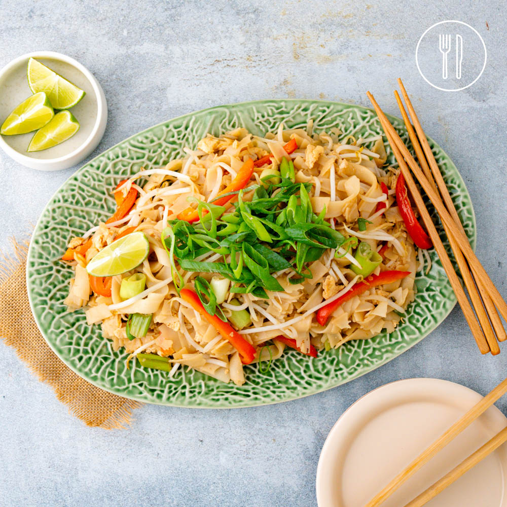 A vibrant and delicious take on a classic, featuring rice noodles tossed with scrambled eggs, crunchy vegetables and flavours of garlic and lime.