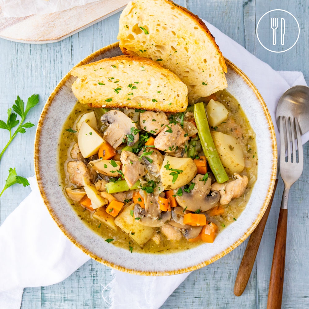 This rustic chicken stew is perfect for a chilling night, flavoured with tarragon herb mix, packed with veggies, set and forget until it’s time to make the garlic bread!