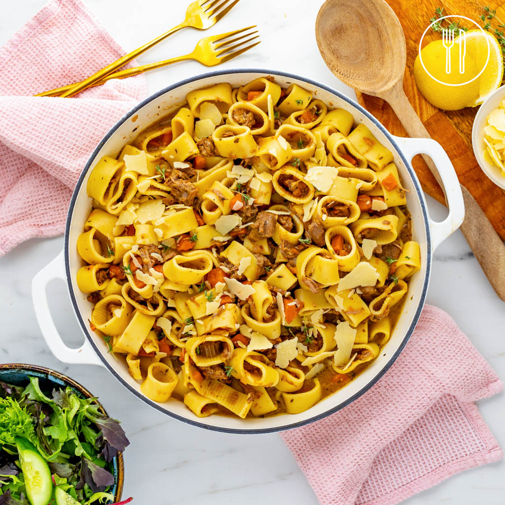 Diced lamb leg slow cooked in a thyme-flavoured white ragù, tossed through pasta, served with parmesan cheese and a fresh garden salad.