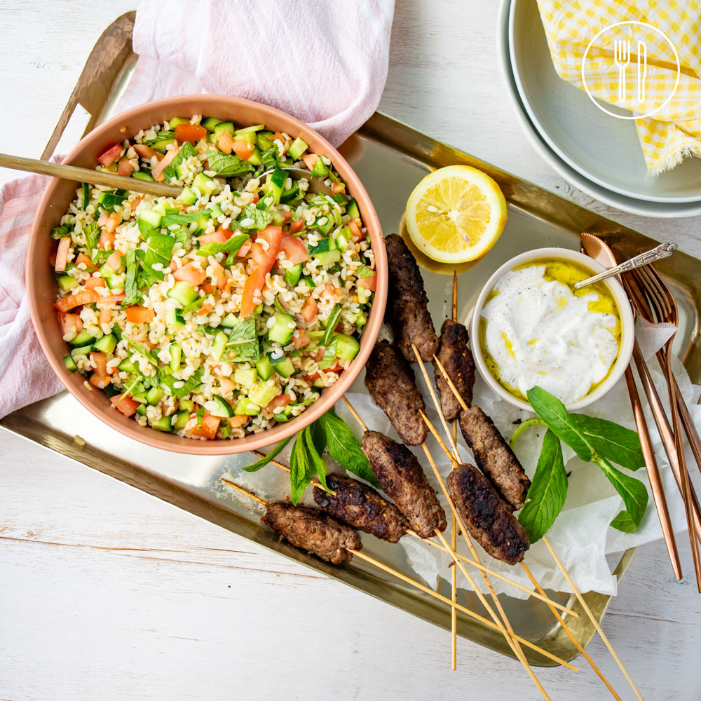 Lamb mince koftas boosted with a delicious blend of sesame, sumac and ground spices, served with a fresh mint and white quinoa tabbouleh.